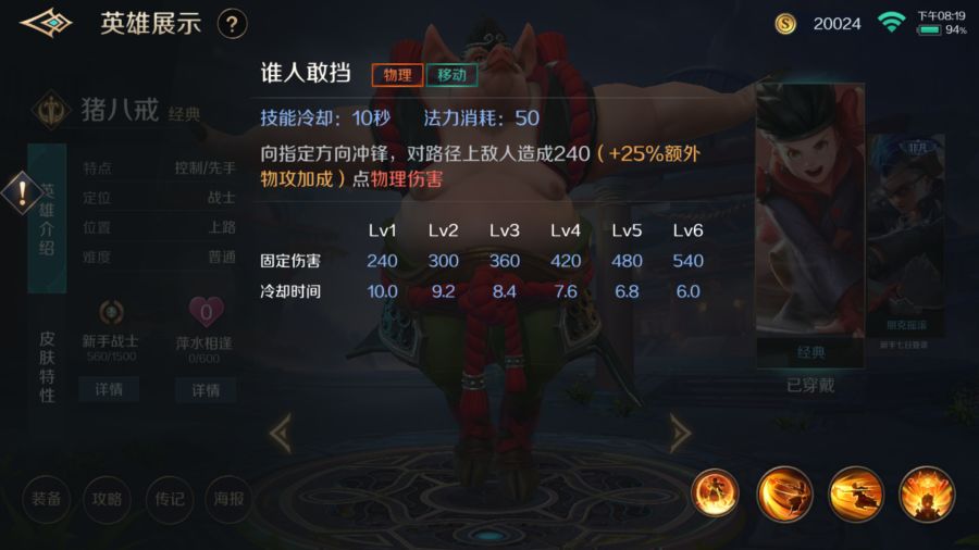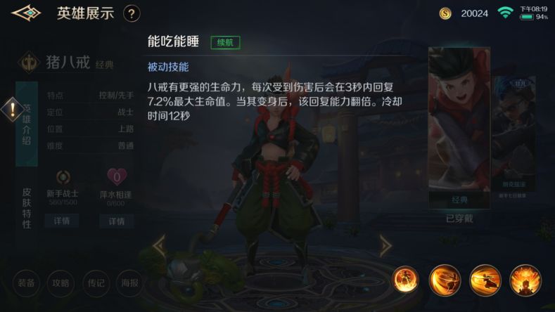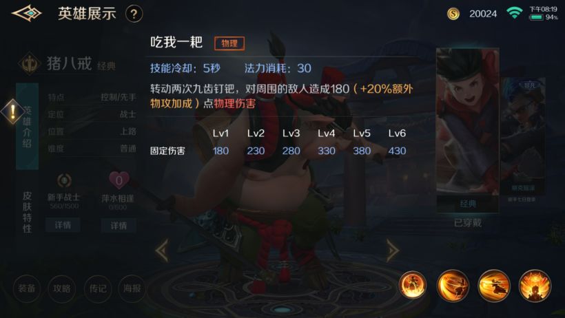 八戒这个英雄的话是个有伤害有肉的较全面的英雄,在现版本强度算是比较强势的。操作较为简单,比较容易上手,对于新手玩家也是不错的选择。以下是对于八戒的介绍和一些简单打法。