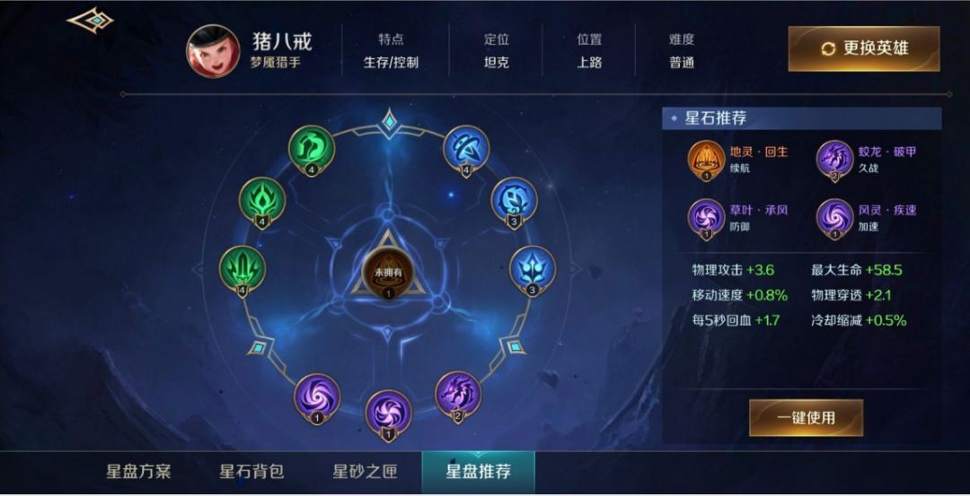 八戒的星盘主要走的是有肉有输出的路线,这样的星盘可以让八戒在战斗中更有战斗力。地灵能增加八戒续航能力,使八戒可以更好的赖线。蛟龙与草叶则是可以增加八戒的战斗力。提升防御和攻击,在团战中发挥更大的作用。风灵更主要的是让八戒的支援能力提升,快速到达战场,为团队提供更大的作用。