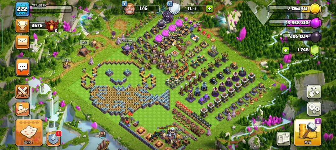 推荐理由:这是一个(部落战阵型+大本中置+诱导+对称)的阵型,一个几乎无敌防三阵,(援兵推荐三个冰人加弓箭)(法师塔调成伤害法术,我这里还没有时间升级将就用着)敌军无论是从先进攻爆本还是正常操作,后面的电塔炸弹和多头单头地狱塔都会给部队施加很大的压力,同时也在外布置了一些防御建筑,防止清边拉百分比,满防状态下,防御效果很明显。