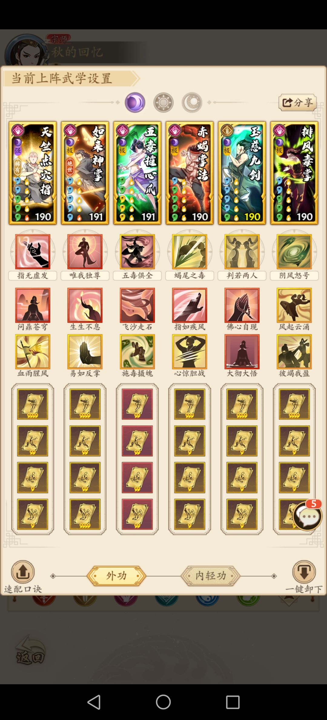 其中招式阴拳,很容易和招式阳拳互相转换,用来克制敌方属性,但要求是武当派时氪金量很大,游龙即使不全绿勾玉也要至少绿一小半,否则聚气太低也很难畅玩。(如果勾玉低游龙辅助位当然可以,但是如果只有一蓝两蓝勾玉,还是会大大减少聚气速度)