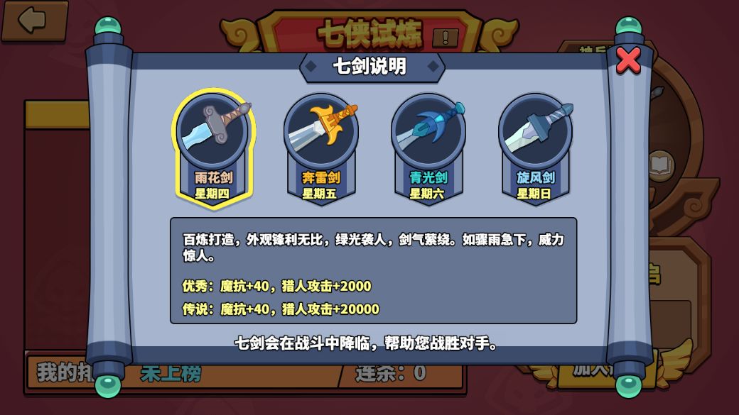 由于七侠试炼每日固定出现一柄神剑,当天的试炼战斗中,所有的宝箱掉落的装备均变为此神剑,因此每日的七侠试炼选择的阵容也会大为不同。周四的神兵是雨花剑,雨花剑提供魔抗以及猎人攻击伤害,使猎人阵容在这加持下大放异彩。