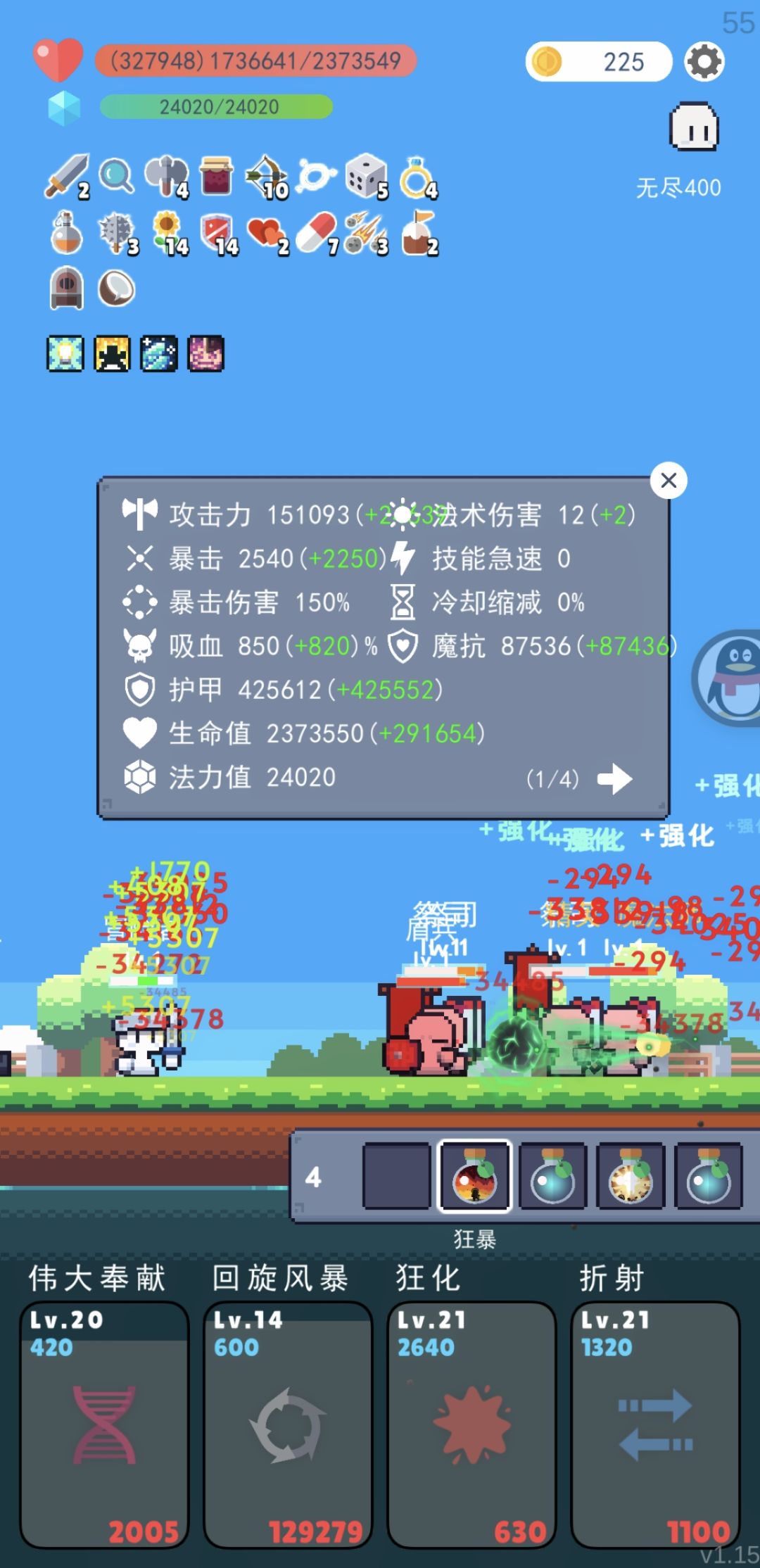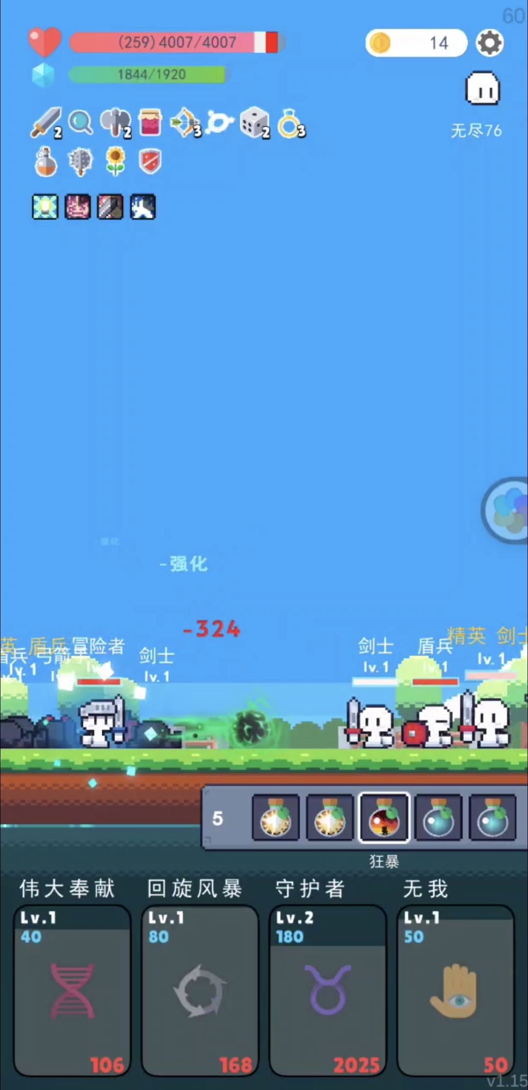 中期(50~100波):这个时期最主要的任务就是把四神技点出来,四神技分别是:伟大奉献(真神)回旋风暴(神)狂化(神)折射(伪神)折射换战争狂热也没问题。然后就是疯狂买买买向日葵近卫盾和我之前提到的道具堆血/盾,埋灭之力和铁钩也可以买几个。然后就是疯狂磕药水,暴毙了依然是大退然后磕药即可。