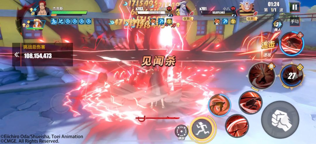 步骤3:长按普攻「见闻杀」开启1技能的替换技能 - 「剑气斩」,能量打完后爆气,继续长按普攻+「剑气斩」(红发·杰克斯每轮打2套剑气斩)