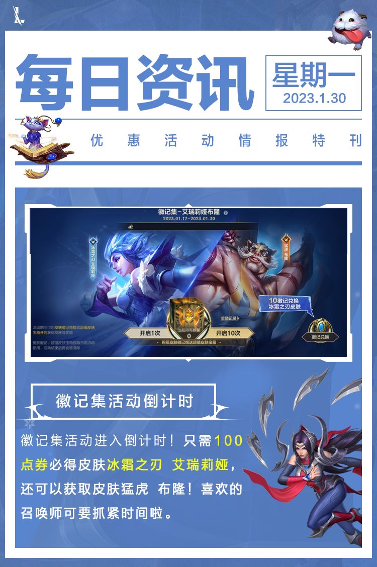 双倍快乐,一次满足!徽记集活动的宝箱在闪烁最后的光芒,截止至1月30日(今日),召唤师可花费10点券购买超值皮肤宝箱,就可以抽取皮肤冰霜之刃 艾瑞莉娅和猛虎 布隆。