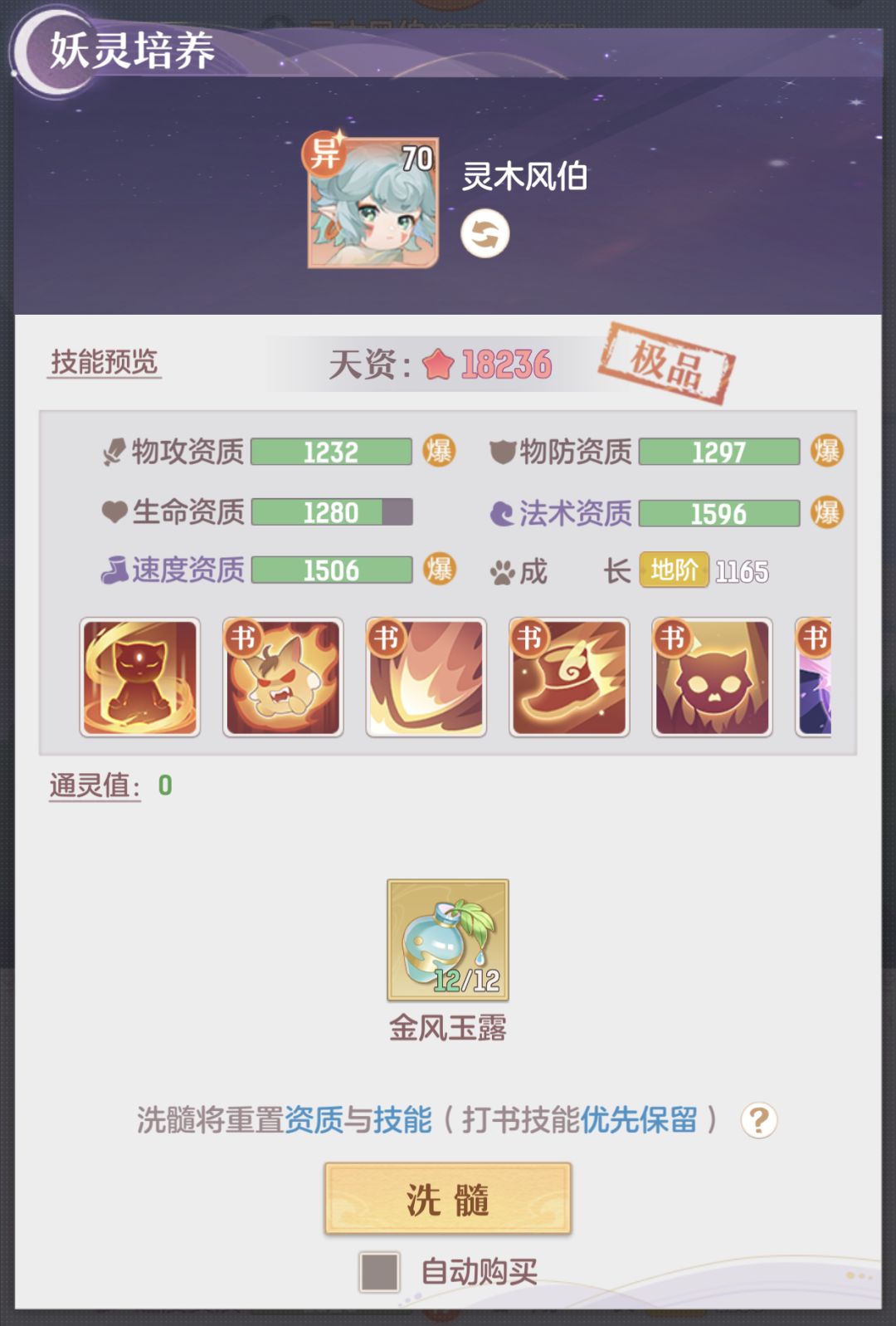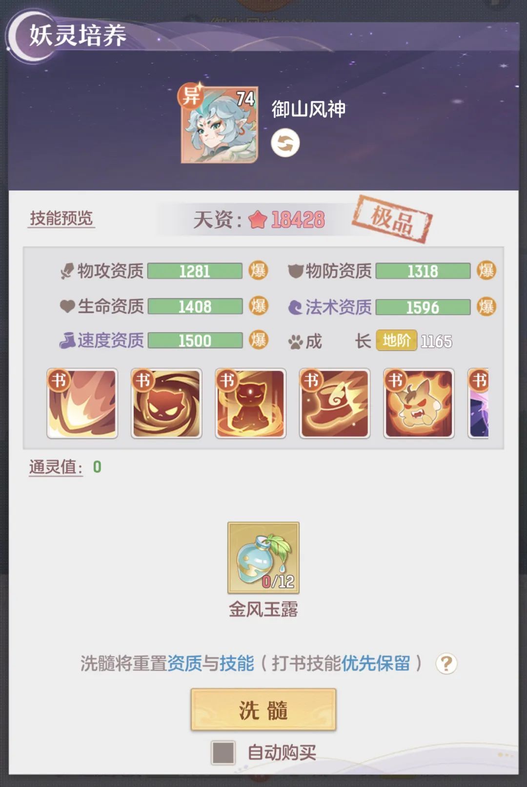 不吃丹爆顶法资,也能很快乐的玩耍。接近满资质的法资和速资,不得不说这个风伯赢面很大,想必御灵师花了不少金风玉露吧
