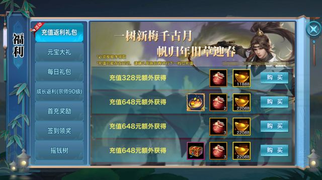 2月充值返利已就位,元宝、元宵福袋、惊喜好物就在前方!2月1日-2月28日,少侠们可在【福利】处参与充值返利活动。