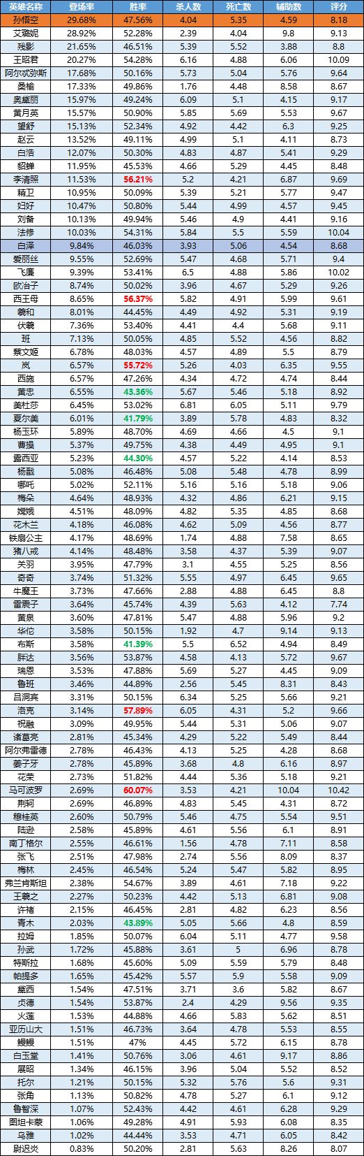 注:此榜单按出场率由高到低排序,标红为胜率前5的英雄,标绿为胜率排名倒数的英雄