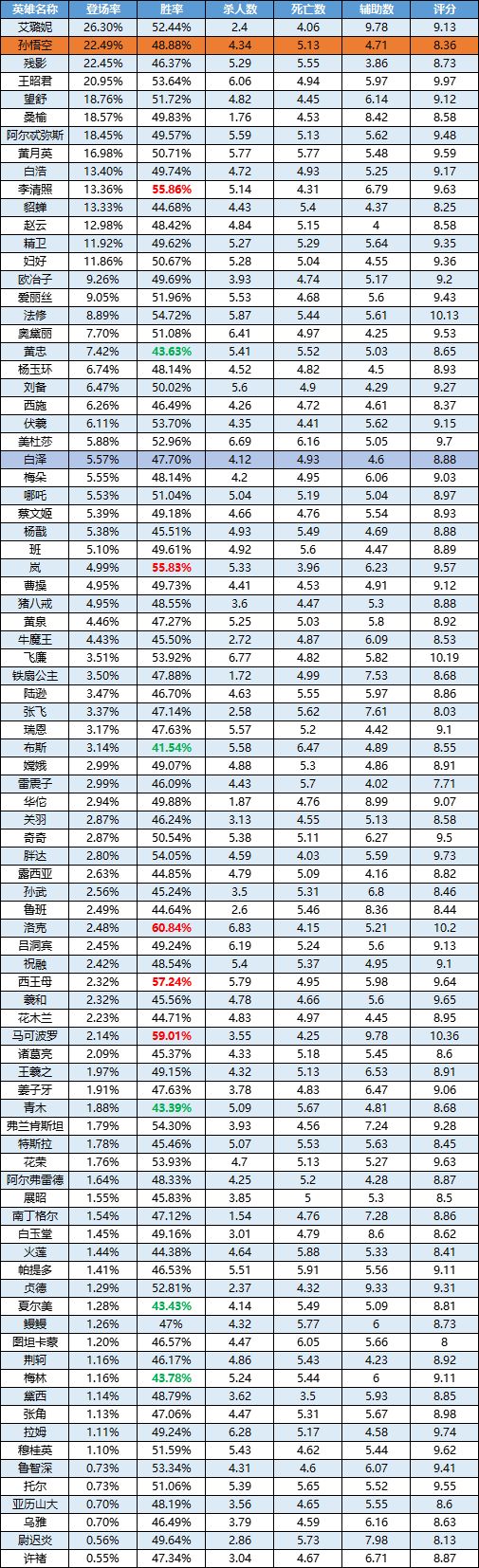 第二周孙悟空在高分段的数据有所下滑,但仍然不错;白泽的胜率也保持在52-53之间,低分段表现乏善可陈,主要还是因为该英雄需要通过不断的位移配合普攻技能打出爆发伤害,对操作还是有一定要求;该周的洛克全分段胜率榜第一,不需要多赘述太多,懂的都懂