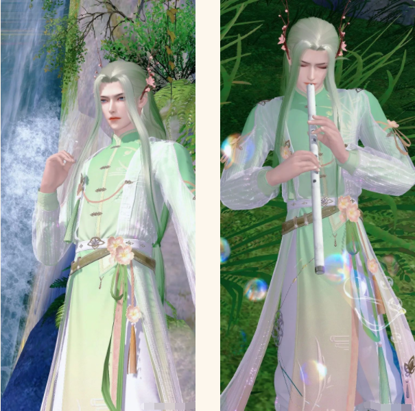 二月莺飞草长,要来和着溪水潺潺,听一曲笛音吗?秀发垂落肩头,花朵点缀衣间,好一个翩翩公子。