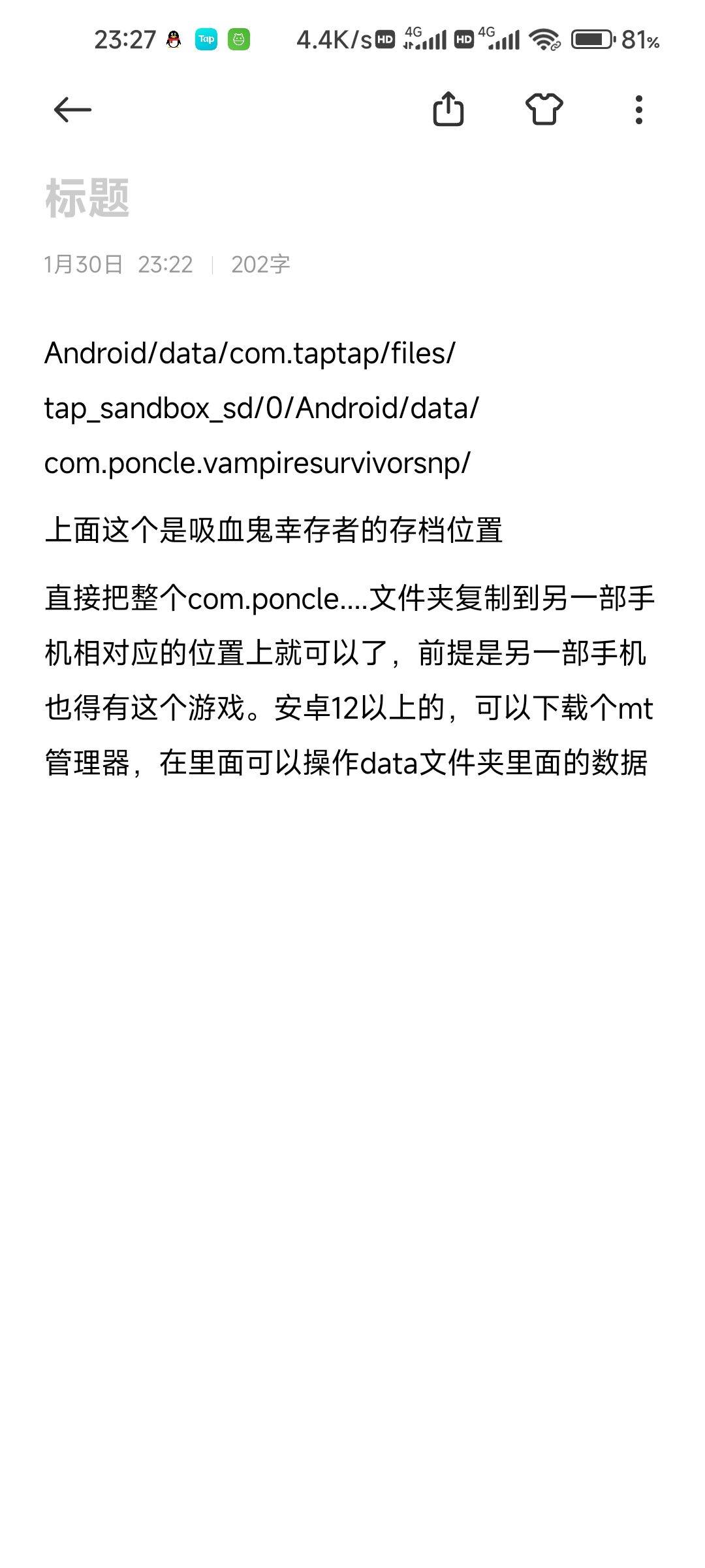 兄弟们,我知道手机版的存档在哪里了,我一直是用备用机玩这个游戏,今天想转到主手机这里玩,找了TapTap的目录,找了半天,终于发现了吸血鬼幸存者的存档位置在哪里了,现在可以另一部手机玩不用重新开始打了
