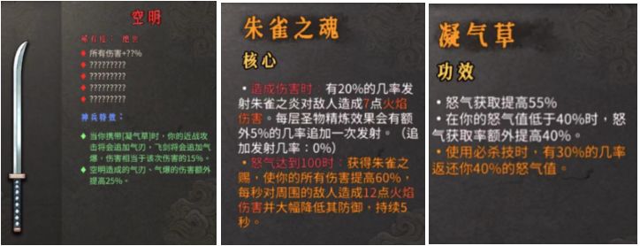 举个神饮明王-醉歌搭配空明(武器)+朱雀之魂(核心位)+凝气草(功效位)的例子,实际上这个套路并不需要专属武器,搭配空明只是因为出门没有刷火硝石,做不到酒葫芦自燃,所以用凝气草加空明的套路来快速触发怒气技,变相达成无限火鸟(其实这里如果是醉歌套路比较建议出门功效位带火硝石,核心位带朱雀之魂就可以直接出门触发了,剩下的就只是提高攻速跟精炼圣物数量问题)