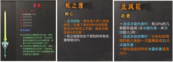 举个三川苦寒菩萨-白霜搭配雪莲(武器)+死之莲(核心)+北风花(功效位)的例子
