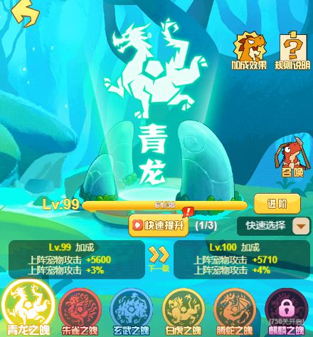 规则说明青龙之魂与朱雀之魂只可以供奉A,B,C品质的宠物恐龙,且朱雀之魂是要到200关才能开启,新手如若宠物恐龙不够除了从召唤里抽取宠物龙,也可以看视频快速提升,到了第300关激活了玄武之魂,玄武神魂是不限宠物龙等级供奉的,什么宠物恐龙都可以,但还是建议先供奉低级宠物恐龙,到第500关和第600关,白虎之魂和腾蛇之魂就只可供奉SS,SSS级宠物恐龙了,宠物品质越高,经验就越高,这时候就可以供奉高级宠物恐龙了,且神兽之魂供奉到一个程度会要求用宝石才能进阶,大家可以去试炼里免费领取宝石哦!