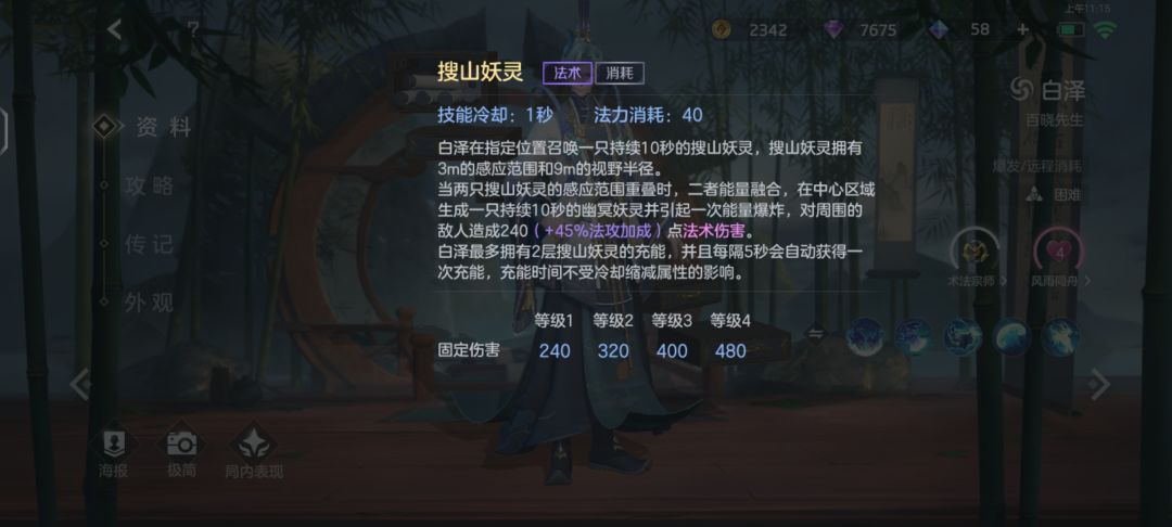 搜山妖灵法术消耗技能冷却:1秒 法力消耗:40白泽在指定位置召唤一只持续10秒的搜山妖灵,搜山妖灵拥有 3m的感应范围和9m的视野半径。当两只搜山妖灵的感应范围重叠时,二者能量融合,在中心区域 生成一只持续10秒的幽冥妖灵并引起一次能量爆炸,对周围的 敌人造成240(+45%法攻加成)点法术伤害。白泽最多拥有2层搜山妖灵的充能,并且每隔5秒会自动获得一次充能,充能时间不受冷却缩减属性的影响。