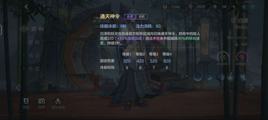 通天神令 法术 消耗技能冷却:9秒 法力消耗:60 白泽和妖灵在自身前方矩形区域内召唤通天神令,对命中的敌人 造成320(+55%法攻加成)点法术伤害并削减其40%的移动速程度,持续2秒
