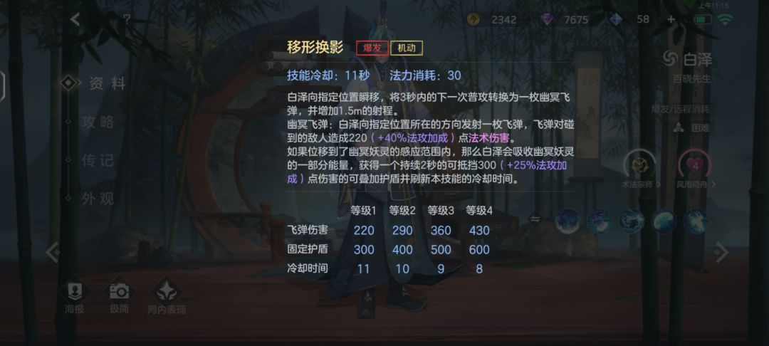 移形换影 爆发 机动技能冷却:11秒 法力消耗:30白泽向指定位置瞬移,将3秒内的下一次普攻转换为一枚幽冥飞 弹,并增加1.5m的射程。 幽冥飞弹:白泽向指定位置所在的方向发射一枚飞弹,飞弹对碰到的敌人造成220(+40%法攻加成)点法术伤害。如果位移到了幽冥妖灵的感应范围内,那么白泽会吸收幽冥妖灵 的一部分能量,获得一个持续2秒的可抵挡300(+25%法攻加成)点伤害的可叠加护盾并刷新本技能的冷却时间。白泽二技能释放后,会强化下次普攻,并增加1.5米的射程。