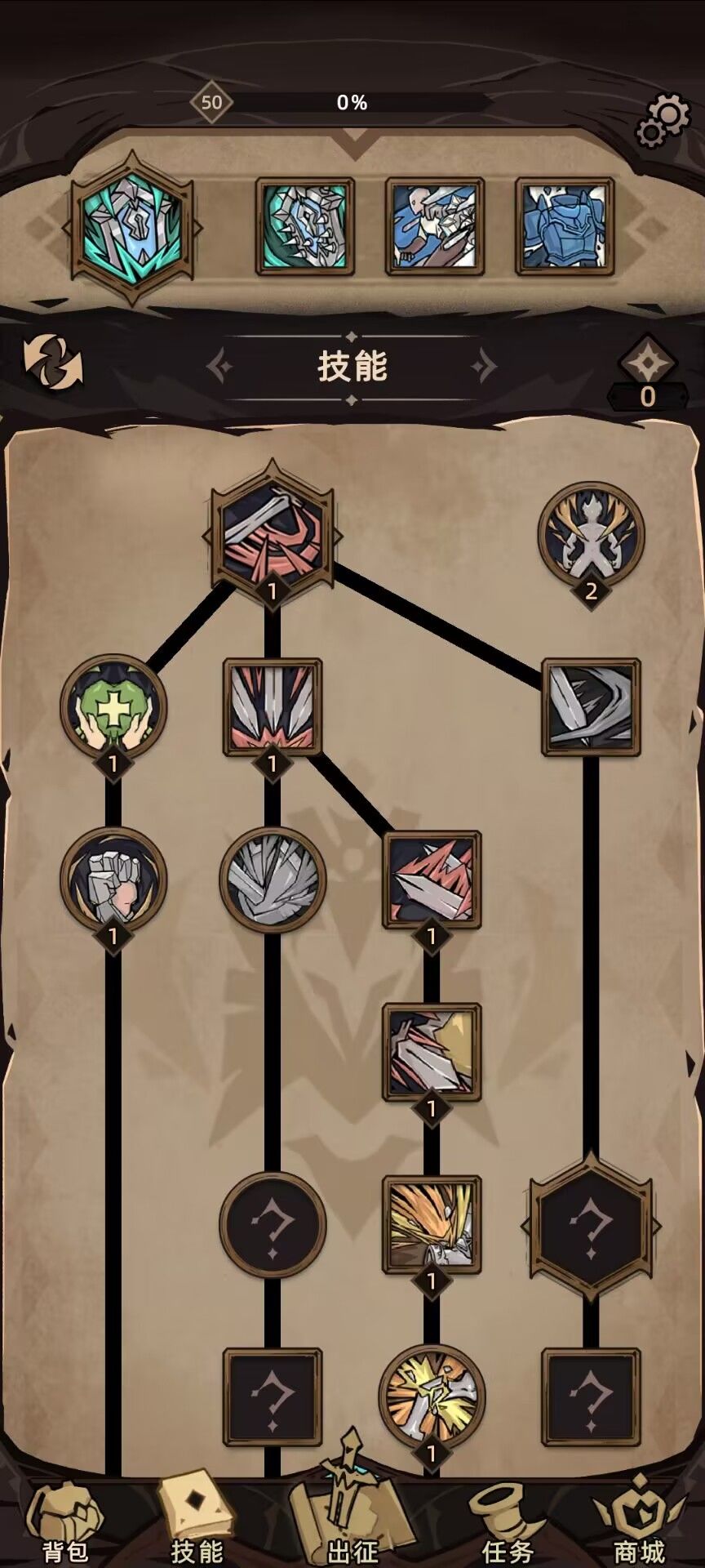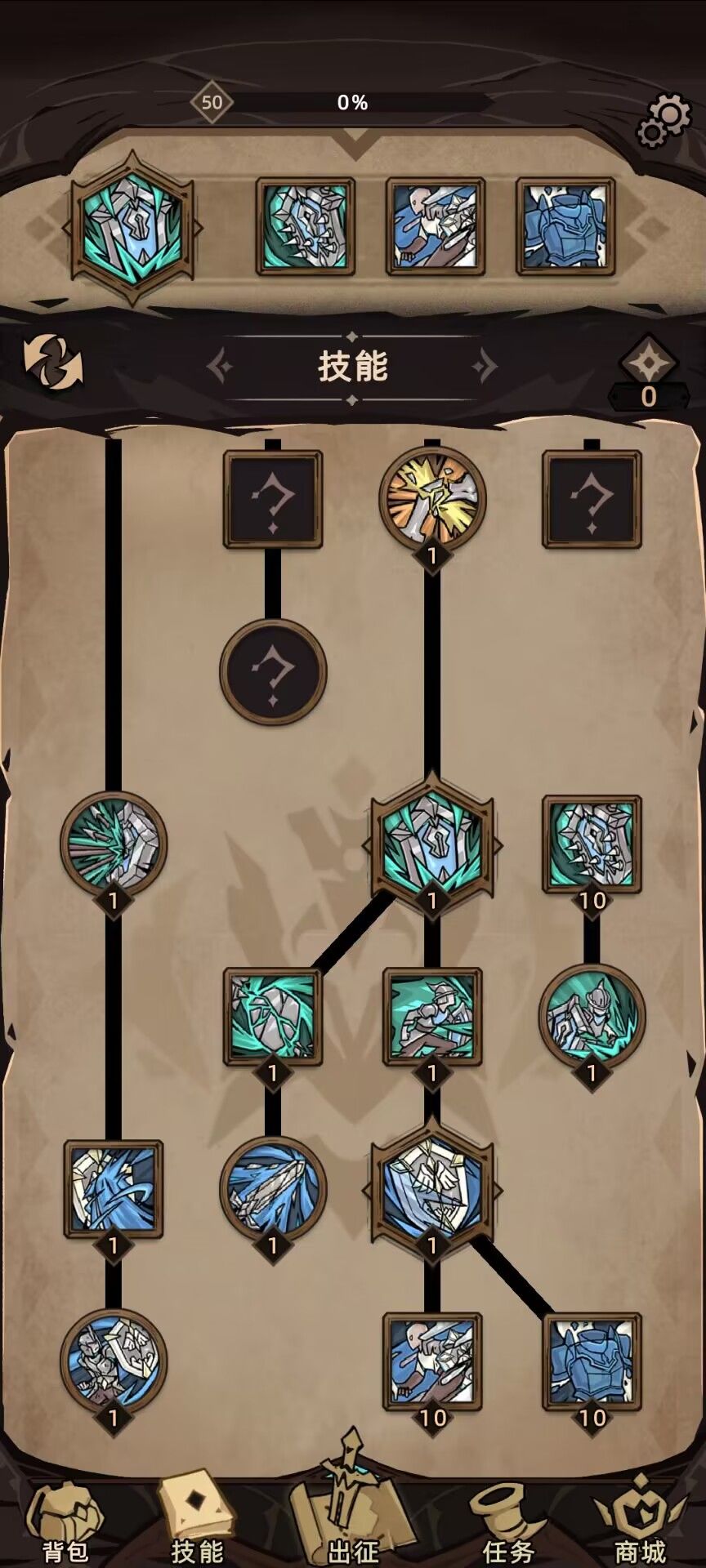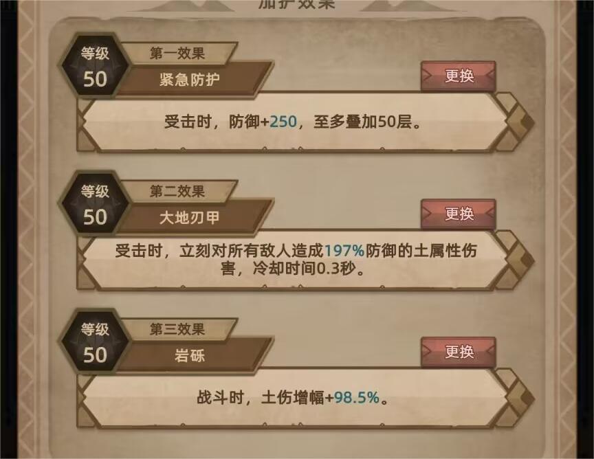 紧急救护 拉满之后可以提供高额的防御值,大地刃甲 可以提供高额的反伤,岩咬 则是因为前期缺少群伤所以需要带的群体技能,拉到10级即可,后期换成 岩砾 来增伤