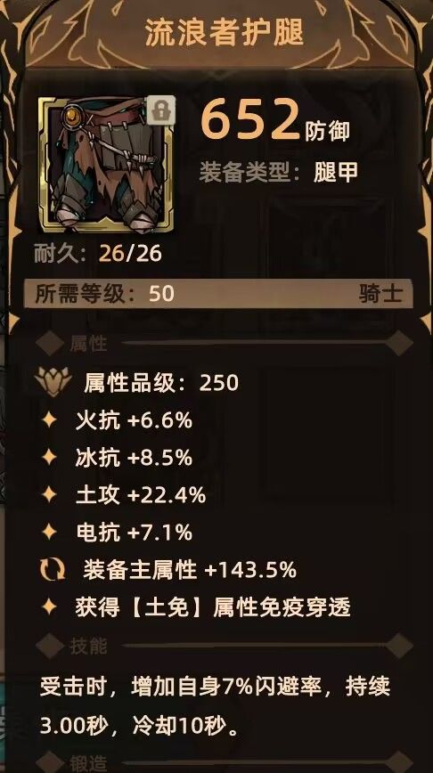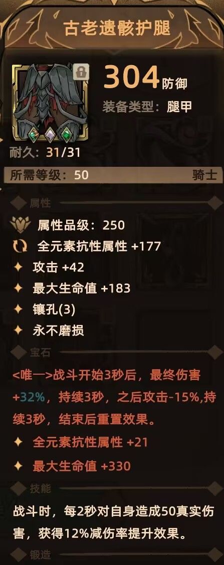 裤子:流浪者护腿 提供较高防御,少量闪避,自带破土免 古老遗骸护腿 3孔高抗性,自虐加减伤(盾勇需要一定的自虐)