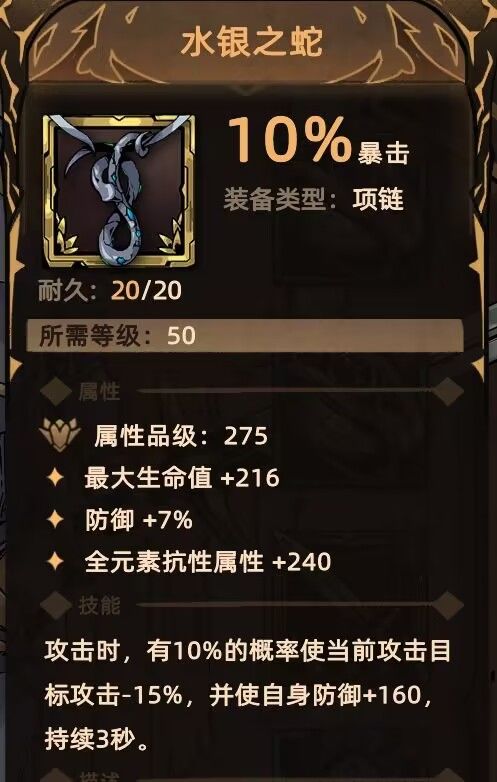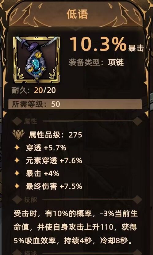 项链:水晶之蛇 百分比加防御,攻击加防 低语 提高输出效率和吸血