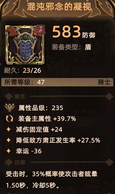 盾牌:螺纹圆盾 高额防御+部分减肃正 混沌邪念的凝视 高额减肃正(待会会聊到) 远古之骸大盾 短暂提高大量防御,破免