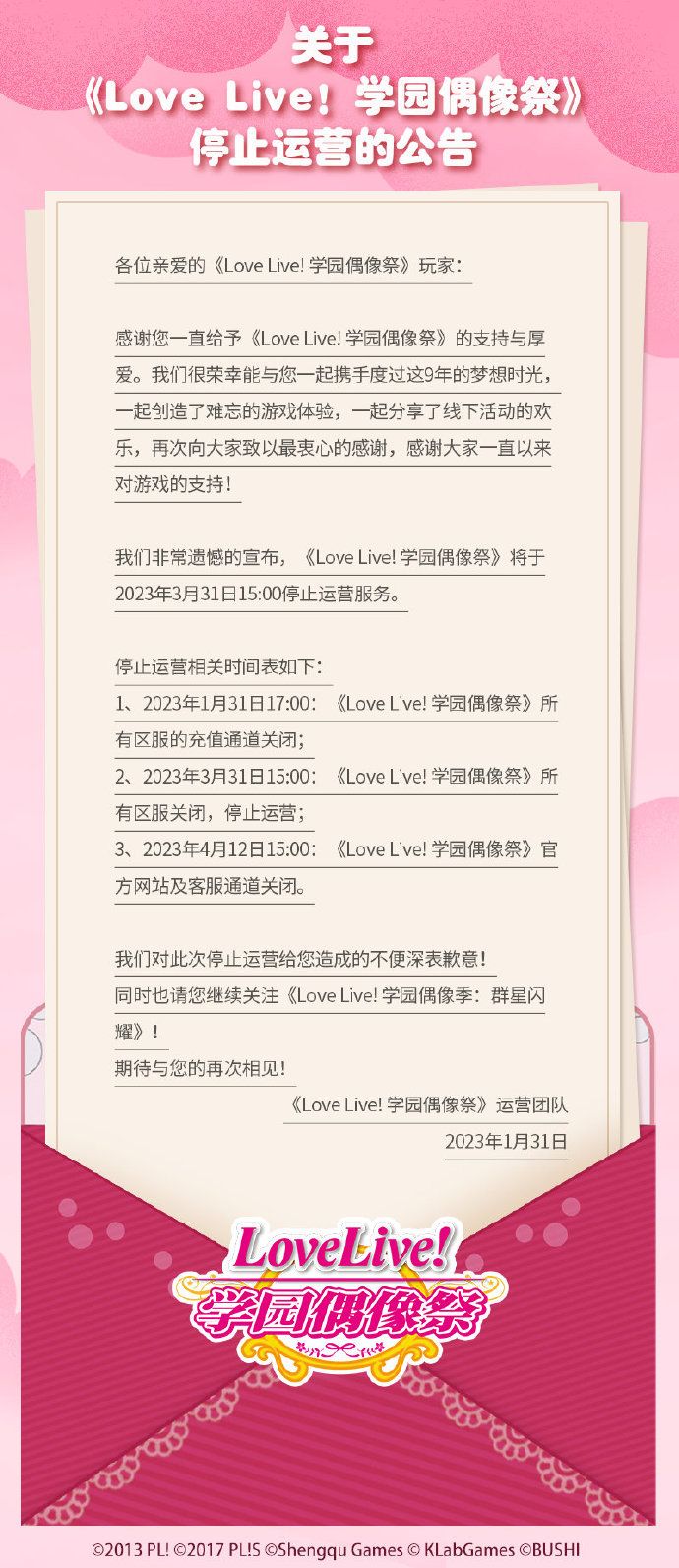 说声告别,《LoveLive! 学园偶像祭》中日服宣布3月31日停服