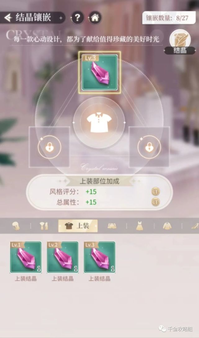 而分解服饰得到的结晶我们还可以镶嵌到我们的不同部位,也是有属性加成的。每个部位有3个结晶镶嵌位,当身份上升到一定等级即可开启。结晶镶嵌后对指定部位服装有属性加成,结晶等级越高增加的属性越多,结晶的加成包含风格评分加成和总属性的加成,加成值也是相同的。