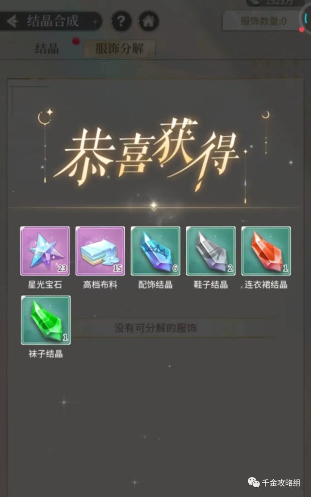 当我们获取到多余服装就可以分解掉,,我们分解掉服饰不仅可以得到结晶还可以获得进阶服装的稀有材料,分解4星以上的服饰可获得服饰概念图。