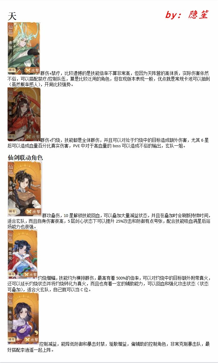 朱雀+李逍遥+赵灵儿+林月如:毫无疑问的现在最强阵容,虽然没有前排,但全员天的高体质站场也不算太吃亏,有伤害有控制有增益有减益有回复有驱散,仙剑三角之间以及朱雀赵灵儿之间都有着非常好的技能配合,这套阵容的唯一缺点就是贵了~