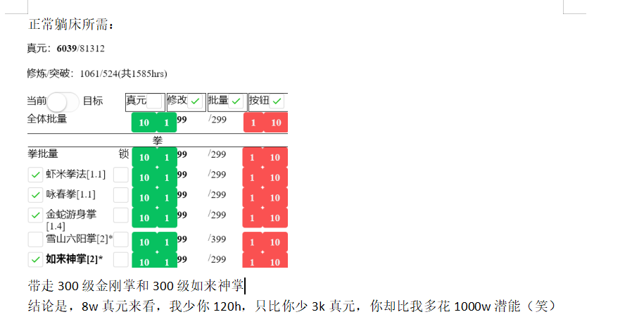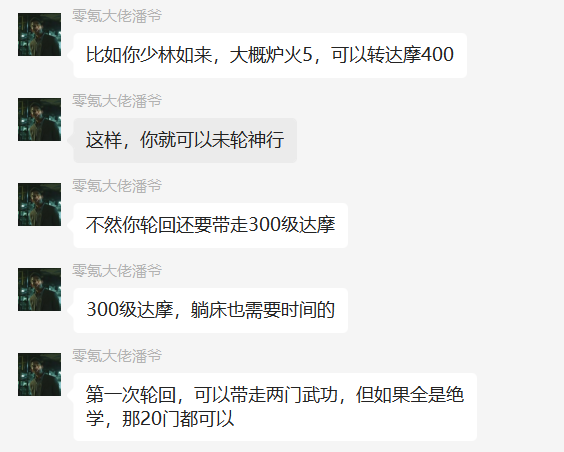 大概意思是,慢轮,升级352级基础拳法,如来趟360级,武学转化400金刚掌,蹲门派绝学般若,再带着如来,神行,般若,三个绝学轮回,想必于正常玩,多一个绝学。