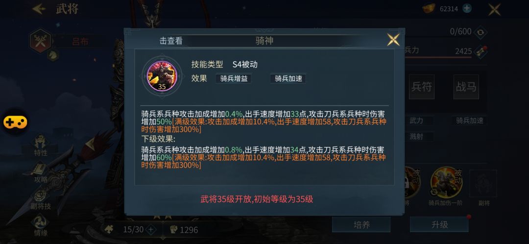 值得一提的是吕布的技能出手58+特性5点出手,应该是目前武力将最多速度加成了。后续吕布也可以为很多武将凑情缘,综上所述,吕布入手推荐指数4颗星