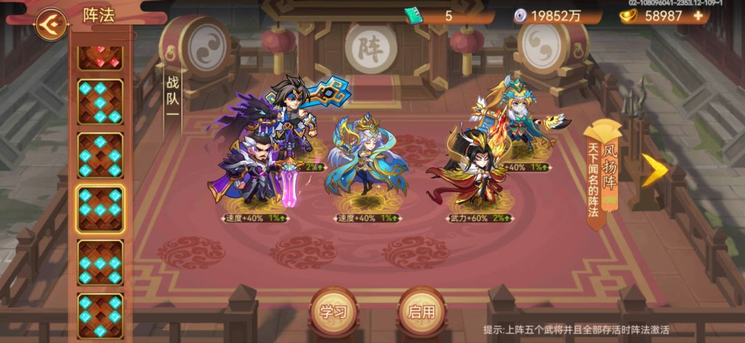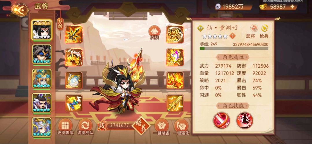 四个辅助都是20左右闪避,童渊为了5点爆伤带了米妹专属,面板74暴击69爆伤28万武力,天赋如下图还没满,单回合弩炮或者大招输出大概630多万,反击300多万。因为白虎阵级别低,用的10级风扬60%武力加成。