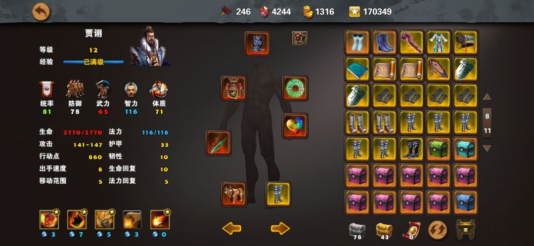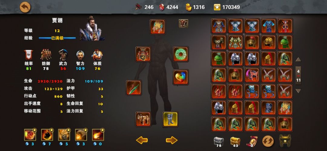 贾诩:雌雄剑、金衣(吉利服、龙鳞甲)、万灵头、和氏璧、五色石、木牛流马(九色鹿)、幼麟鞋