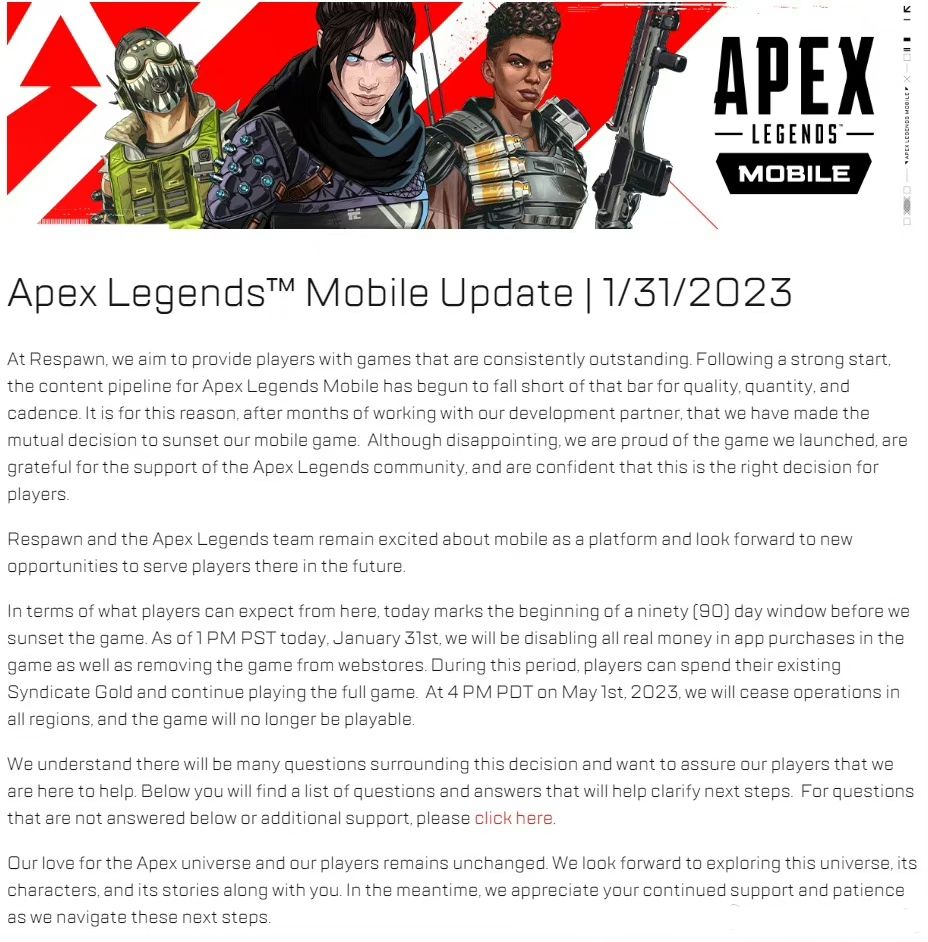 “在Respawn,我们的目标是为玩家提供始终如一的出色游戏。尽管开头良好,但Apex Legends Mobile 的内容在质量、数量和节奏方面开始无法跟上标准。出于这个原因,在与开发伙伴协调数月之后,我们决定终止运营手游。