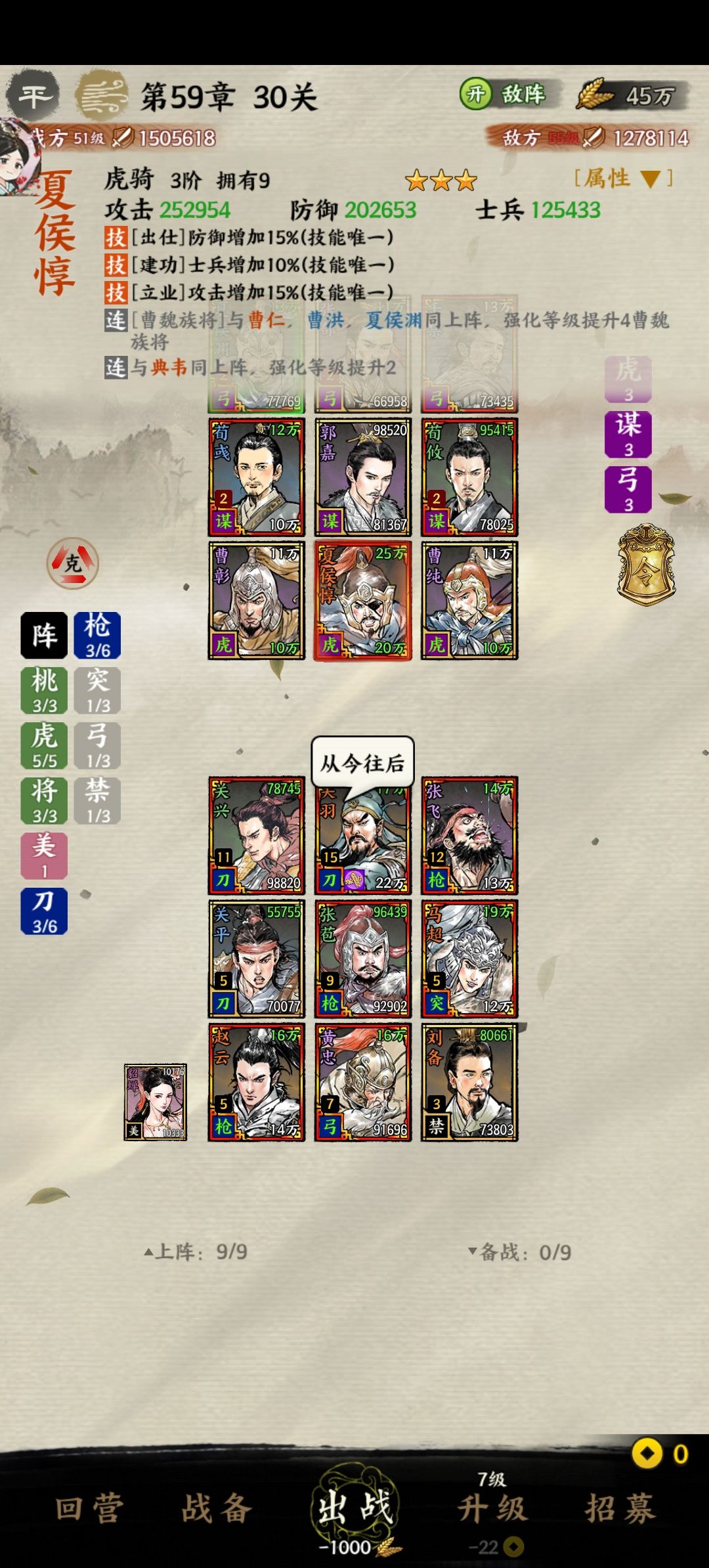 上次发了56章的攻略,57-58用四嘟嘟一路突突就过去了,59章又卡了好几天。对面前面3个虎豹骑,2号位橙卡夏侯惇,攻击十多万,这次用盾扛着也很费劲,思考了几天决定动用五虎加将门的阵容,前期靠重击赌运气。先看一下决战的场面,对面夏侯已经25万攻,可惜这把我5虎全3阶了。