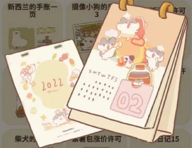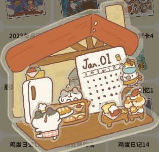 2023年月历:2023年新春信件,祥瑞小兔送的信件,错过时间可以从黑心商人哪里购买或者从扭蛋机里获取,无星星,故事内容:咕咪大厨开了一家烘焙店,打杂的鸡蛋也担任了收银员兼售卖员,海德威则是送餐员,而柴犬小宝也是他们家第一位顾客,当面对这一堆的美食已经快速的张开嘴巴装备进食啦!这下子柴犬小宝又要胖了。