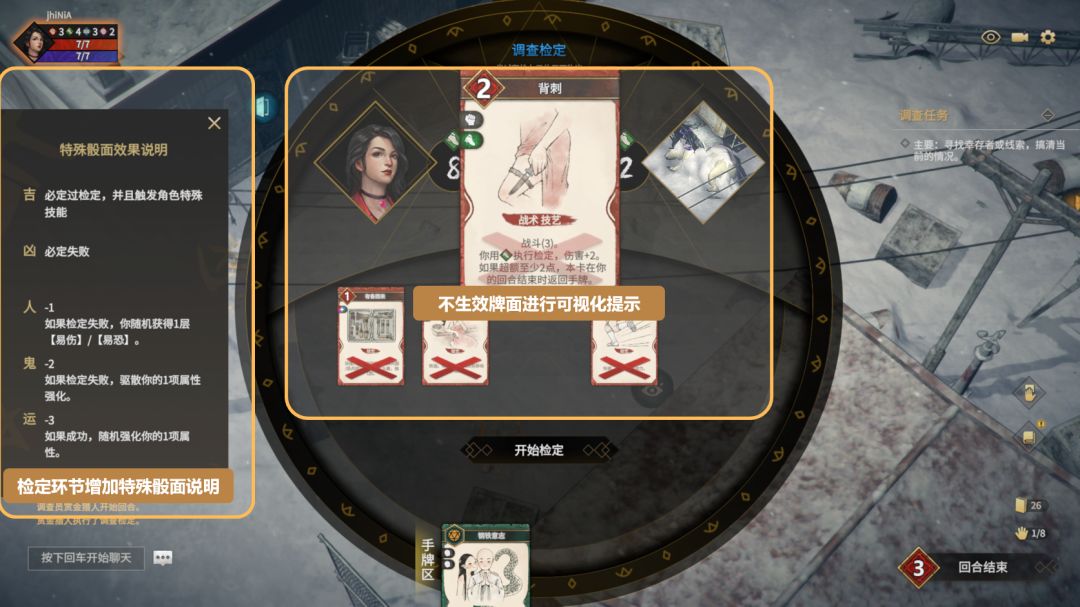 ● 在检定界面增加”?“按钮,可以查看特殊骰面效果说明;(未来还会增加卡牌和角色技能生效效果的展示)