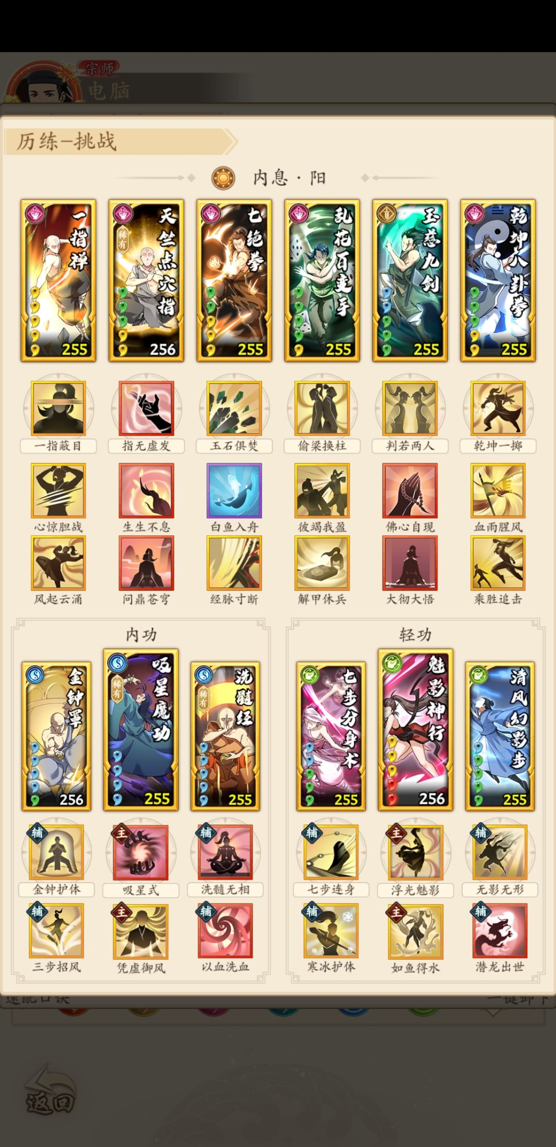 轻内的选择,吸内基本不求伤害,只求站的够久,吸星主运,带金钟,带洗髓(长套路别去管概率),魅影主运,带清风,带7补或者带踏雪,也可以带葵花。招式上以血换血可以主运,也可以不主运,区别就是多换10%血量 和你整个套路少30%拉条区别(凭虚御风多5%一个回合,套路6回合是30%拉条合计),这个看情况而定,如鱼不能改,其他都是拉条技能,阴内息吞月也是可以主运也可以不主运,自己看自身情况决定。