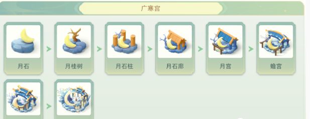 获取广寒宫需要获取月石,由月石合成月挂树,月挂树合成月石柱,月石柱合成月石廊,月石廊合成月宫,月宫合成蟾宫,蟾宫合成广寒宫,最后由4个广寒宫合成嫦娥的广寒宫。