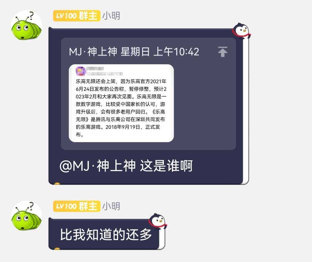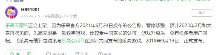 你们看到的那些2月上架的,全都是谣言,并非官方回答(以下图1是你们看到的谣言)而官方只给出了停服公告,并没有发布关于开服的公告,开服公告是另行通知的,官方对谣言也进行了打假(以下图5,小明是官方)停服原因是因为没有版号一直开服成本太大,就选择了暂时关服等版号(以下图2)官方在开服之前也为乐高无限的版号做了努力,拉着全公司的人也没打下来版号(以下图4)当然,也不是永久停服,有版号就会回来,大家也不要伤心,同时也不要相信那些谣言,以官方消息为准(互相传达一下,以官方消息为准,开服官方会另行通知)