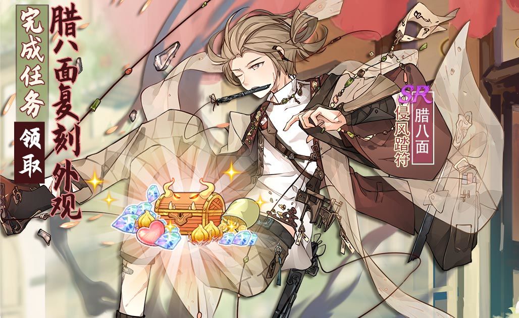 活动描述:活动期间,御侍大人完成一系列指定任务即可获得SR飨灵腊八面复刻外观-侵风踏符。