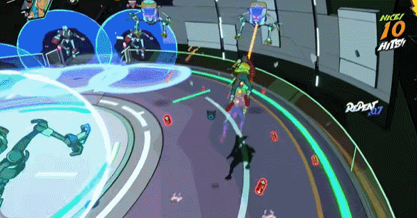 而且它让每一个你能看到的地方都充满“嗨起来”的氛围,仔细看的话,路边左右摇晃的树木;前方弹出来的机关踏板;甚至屏幕上抖动的血条UI......它们的节奏完全相同。