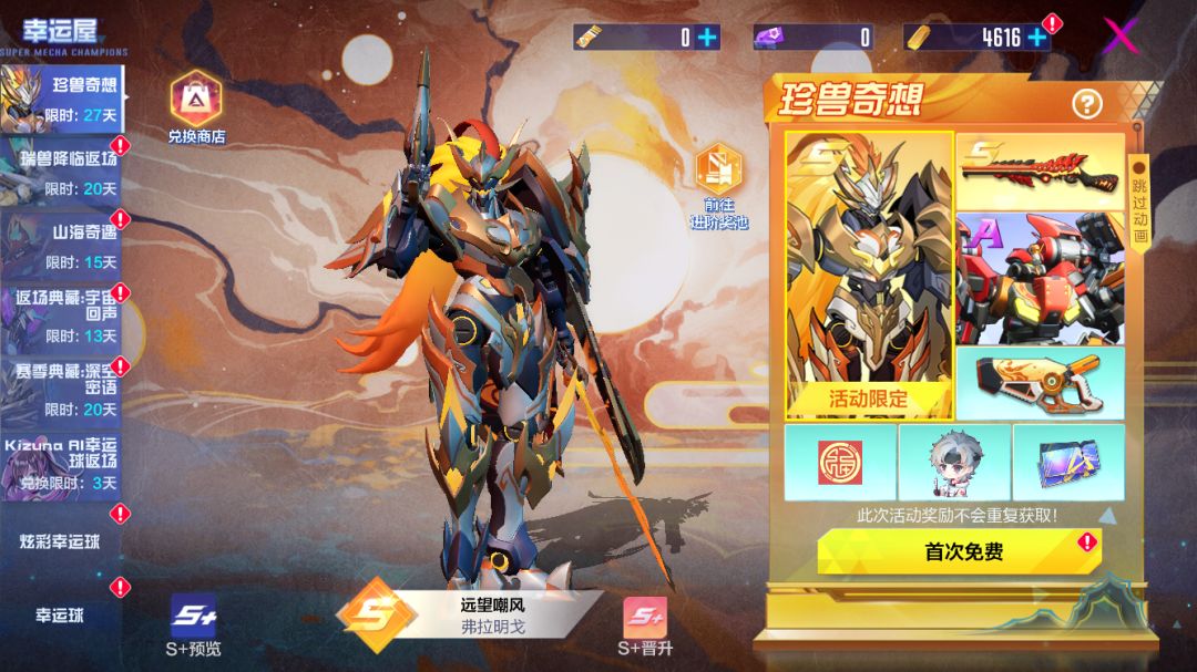 在获得弗拉明戈 “远望嘲风”外观后,更可开启进阶奖池,获取外观晋升卡,解锁专属S+形态。