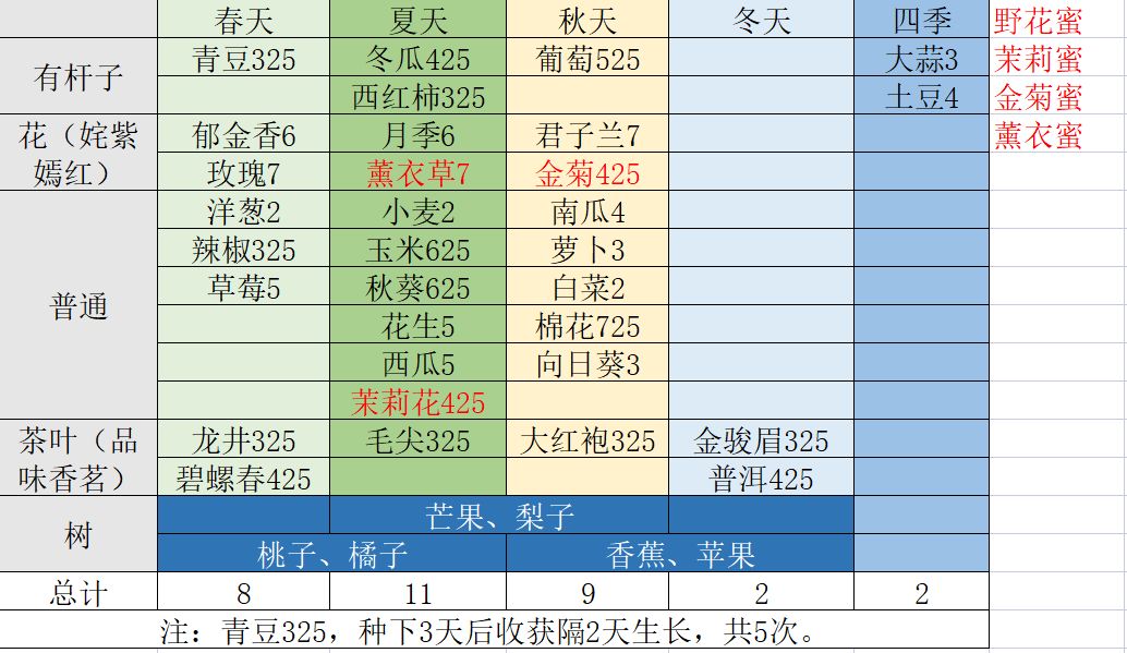 根据楼主整理的种植表,我们可以发现,夏天所需要种植数量巨大多达11种。