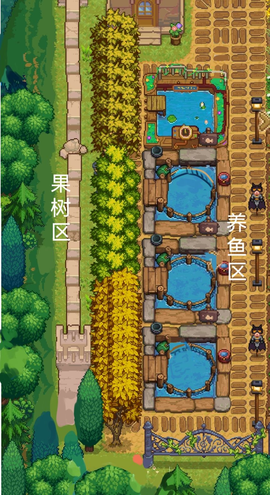 养鱼池无法转动,所以左边留一条路,看上去更合理,最上面是钓鱼池(个人感觉用处不大之前活动买的)