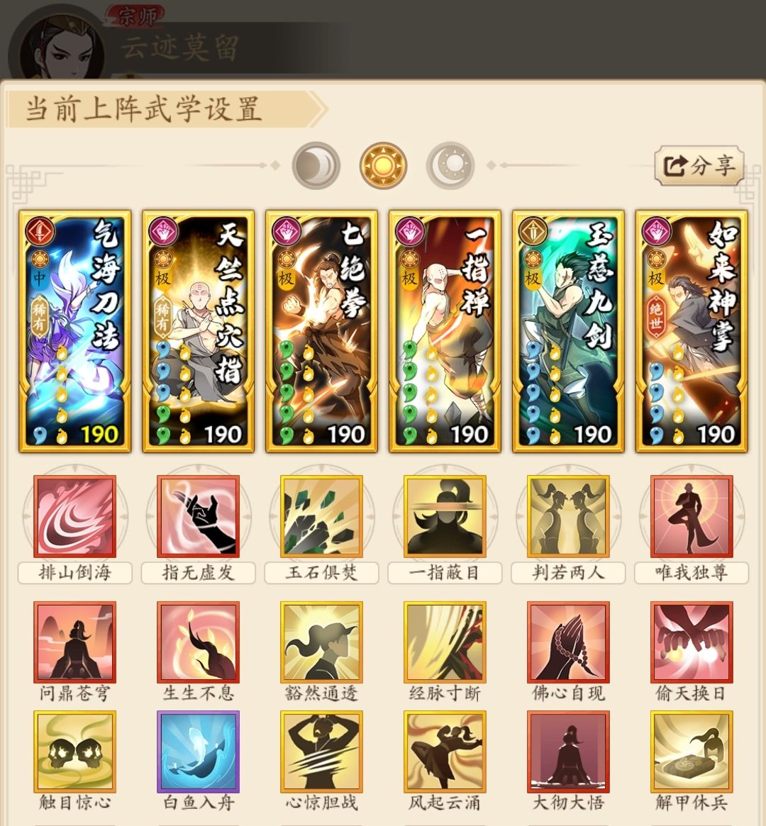 橙框:吸内核心武学。心惊胆战可以和经脉寸断换位,多赚风起云涌10%聚气(我是被一指蔽日演怕了),两者先后顺序需看实战情况调整,优先保证内伤尽可能少的被瞩物思人清除,不要贪七绝拳的招式暴击。