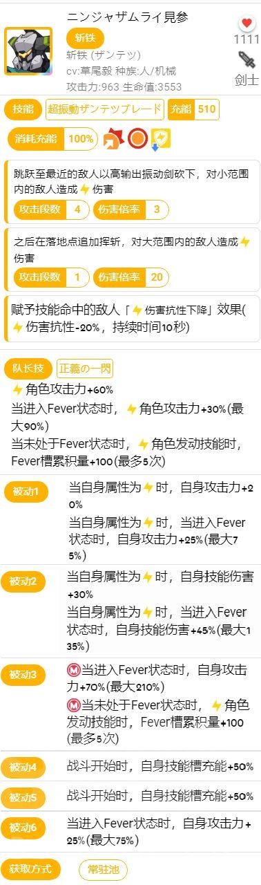雷fever第一名角色将会是今年四月的常驻卡池——斩铁,一身自身强化但更多应用场合是拉条辅助(以及一些雷down),经常用队长技拉条