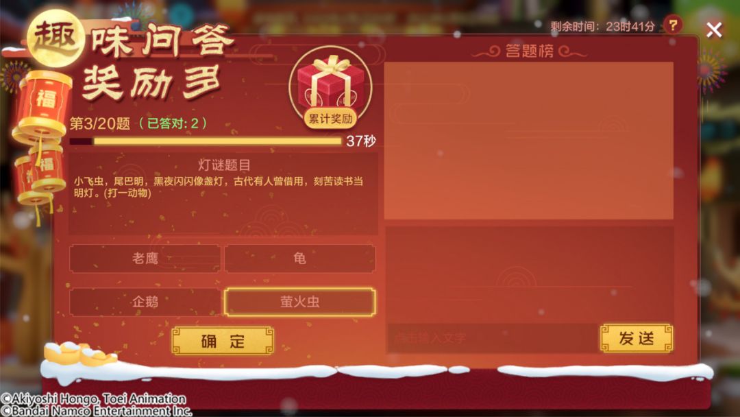 活动内容:活动期间每日可参与一次答题活动,回答正确的情况下可以获得更多奖励哦~另外,活动期间将按照回答正确率以及答题所消耗的时间进行排名,更有丰厚的排名奖励等你来拿!