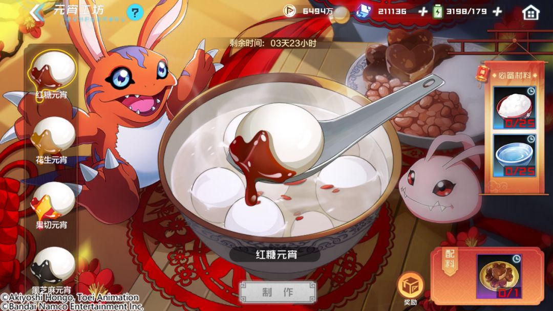 活动奖励:头像框-团团圆圆、稀有召唤券、晶钻、元宵礼券、浓缩药剂、点心大礼包、食材自选箱、成熟期核心代码、金币、数码宝贝经验