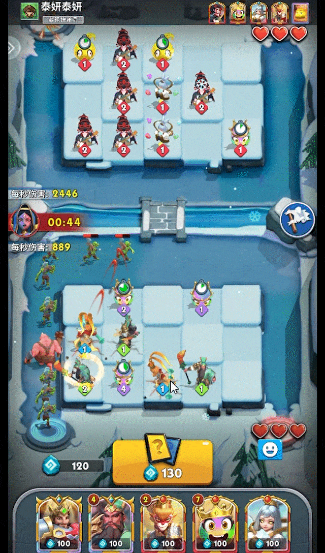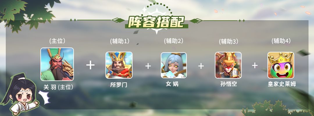 主要思路是开局利用所罗门快速铺场,利用史莱姆升星,由孙悟空复制角色,将关羽铺满全场,再使用女娲对关羽进行升星,当场上铺满关羽后,由队友利用服部半藏对关羽升星,由于关羽释放的【斩杀】是单体技(激活神器后是范围攻击),所以需要队友带控制型角色(如卑弥呼、妲己等)辅助关羽进行输出