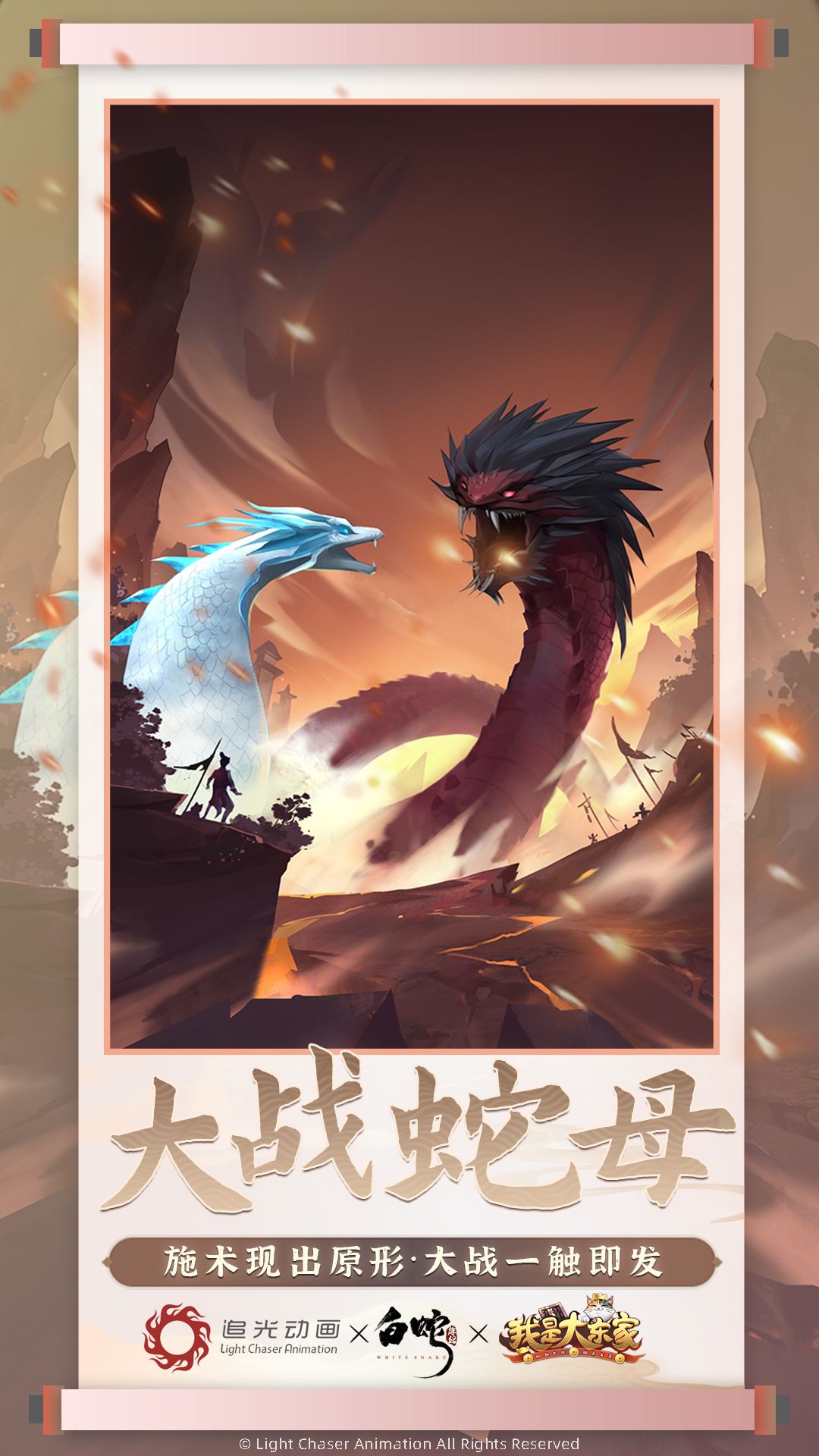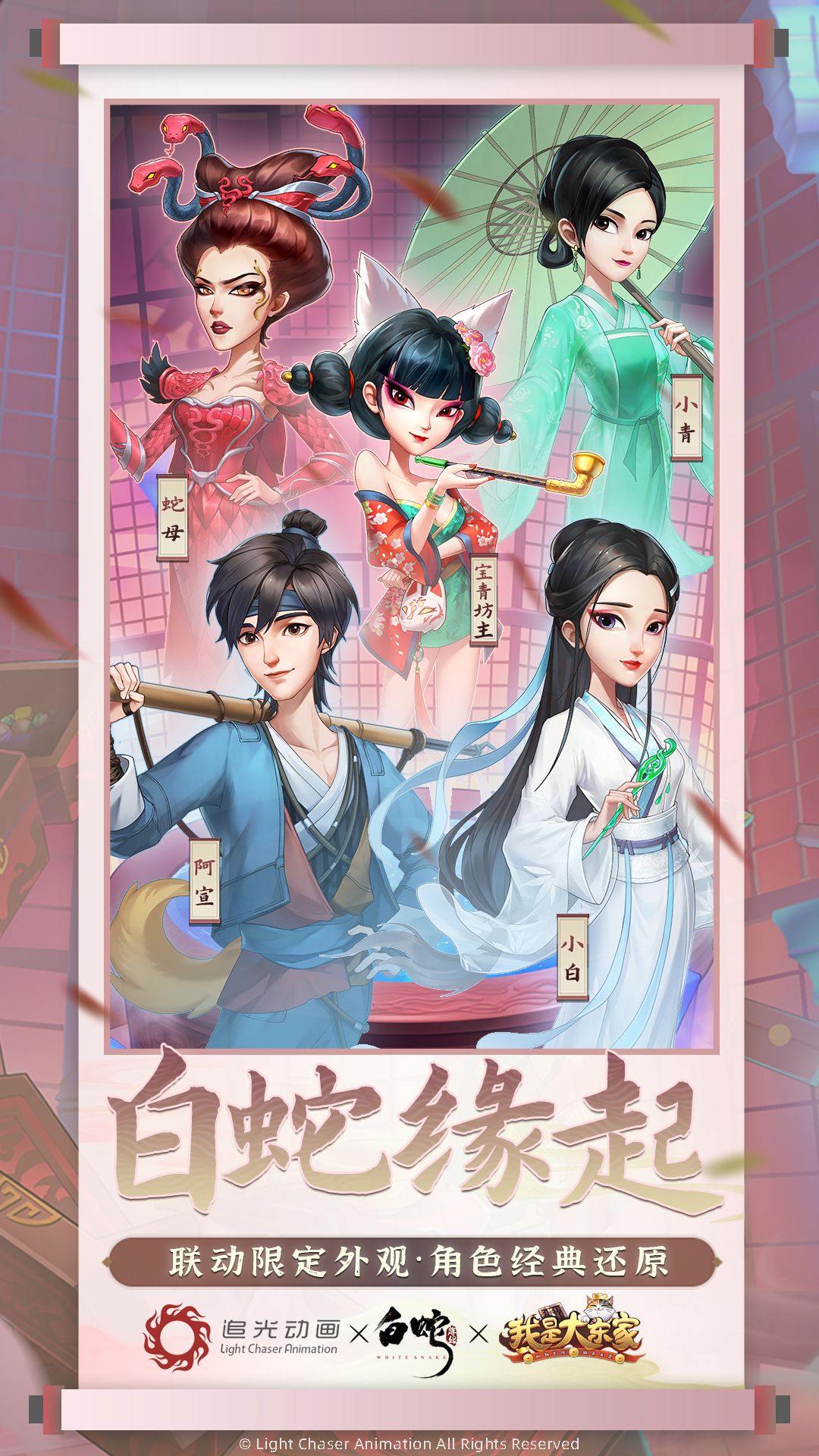 2月8日联动开启后,游戏内除了上线《白蛇:缘起》联动主题活动,宝青坊主、小白、阿宣、小青、蛇母全新游戏形象与皮肤也将同步上线,与大东家一起对抗蛇母阴谋,领略白蛇经典故事的全新演绎!